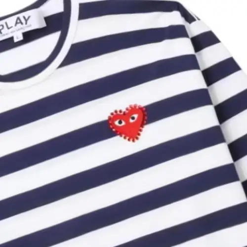 Make a bold yet sophisticated statement with the CDG PLAY Rhinestone Heart Striped Tee White/Navy. This long-sleeve T-shirt is designed for fashion lovers who appreciate effortless luxury and contemporary streetwear. Crafted with precision, it blends timeless stripes with a modern touch of sparkle, making it a standout piece in any wardrobe.